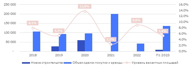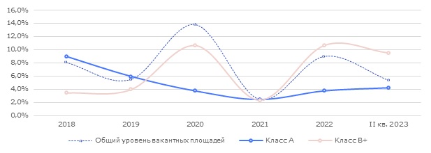 В связи с сокращением ряда относительно крупных свободных блоков, доля вакантных площадей в «Москва-Сити» снизилась на 3,6 п.п относительно конца 2022 г. до отметки в 5,4%, тем самым вернувшись на уровень «доковидного» 2019 г., однако оставаясь выше результатов 2021 года. Таким образом, в рассматриваемом деловом районе объем свободных площадей составляет не менее 67 тыс. кв. м, 63% из которых приходится на объекты класса А.