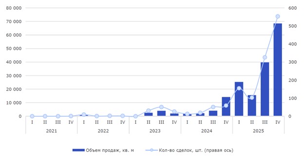Объем заключенных сделок со строящейся офисной недвижимостью Дубая, 2021 —2025 гг.