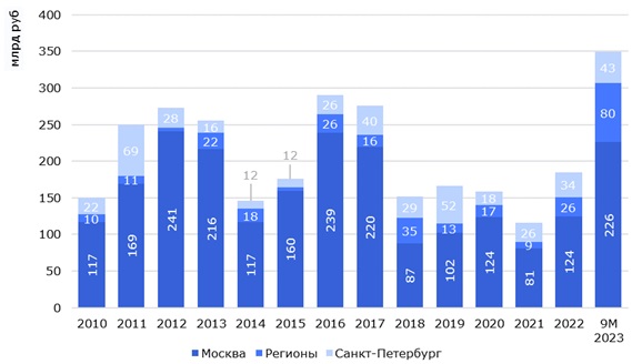 Москва, 25 сентября 2023 г. По итогам 9 месяцев 2023 г. объем инвестиций в коммерческую недвижимость России составил 349 млрд. руб., или $4 374 млн (без учета производств и площадок под девелопмент), что в 2 раза превышает годовые результаты за 2022 г. и в 3 раза за 2021 г. Кроме того, текущее значение является пиковым за всю историю наблюдений в рублевом эквиваленте. По оценкам Nikoliers, объем инвестиций по итогам всего 2023 г. может составить порядка 500 млрд рублей, что также станет рекордным значением по объему инвестиций в рублевом эквиваленте.