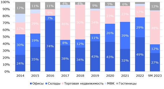 Основной объем инвестиций был сформирован торговым сегментом недвижимости — на него пришлось 48%, или 167 млрд руб. ($2 103 млн). Лидерство торгового сегмента во многом обусловлено высоким количеством «вынужденных» сделок, которые произошли в результате ухода иностранных игроков с российского рынка. Далее офисный сегмент, который занял 27%, или 93 млрд. руб. ($1 133 млн). Гостиничный и складской сегменты заняли равные доли в структуре сделок - по 12% в общем объеме: гостиничная недвижимость - 42 млрд руб. ($528 млн), складская – 43 млрд руб. ($566 млн). Активы, которые сегодня пользуются наибольшим спросом – это активы иностранных компаний, которые объявили об уходе с российского рынка: действующие бизнес-центры, торговые центры с успешной концепцией и складские объекты с надежными арендаторами.